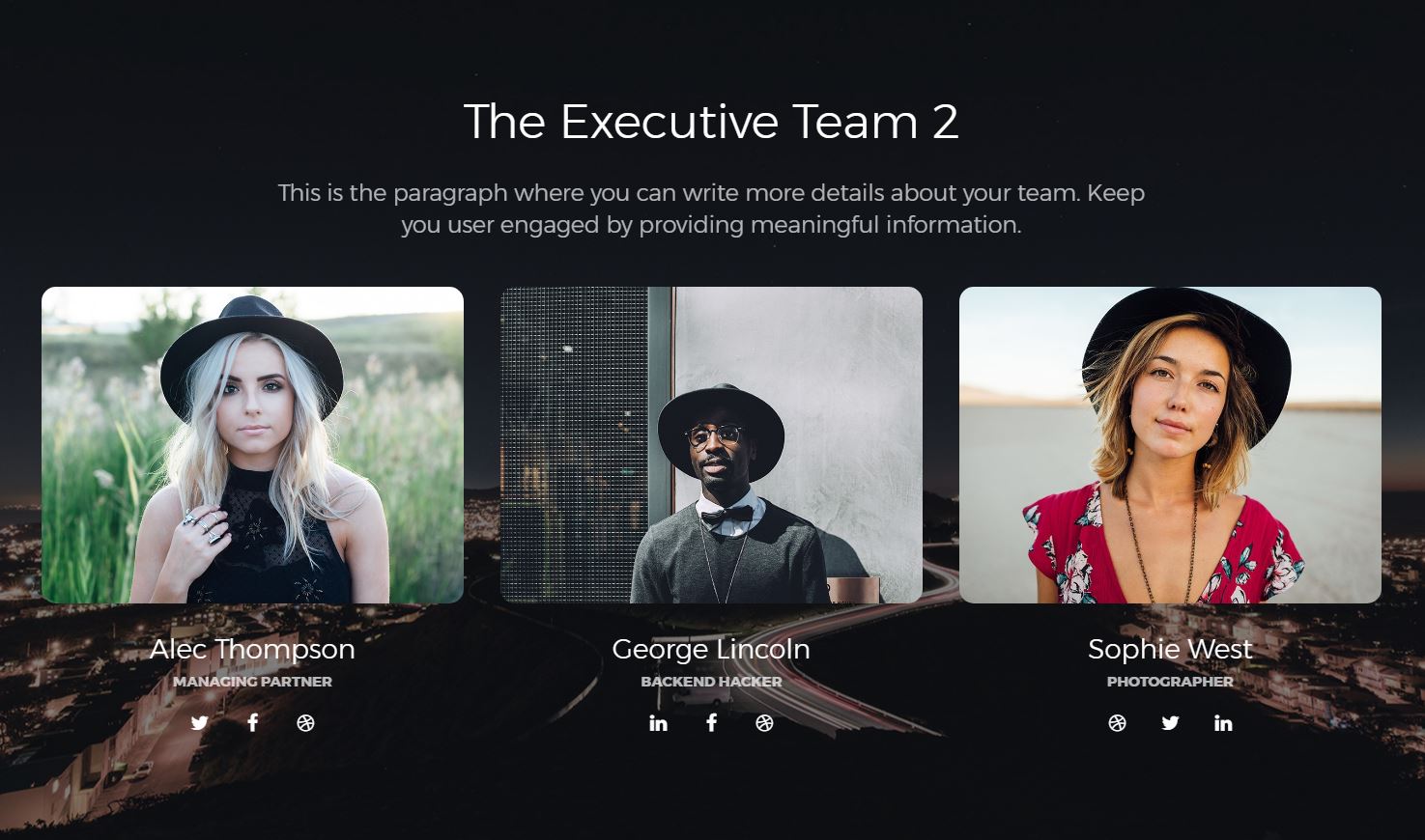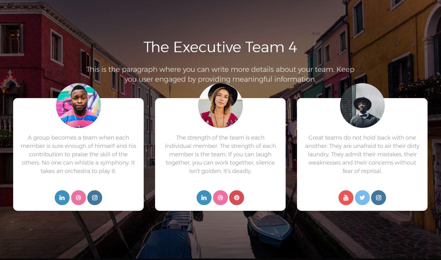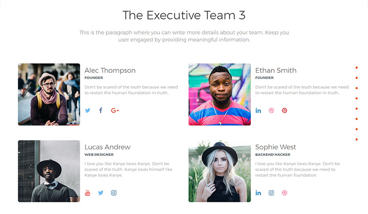 The sections will help you generate pages in no time. From team presentation to pricing options, you can easily customise and built your examples.